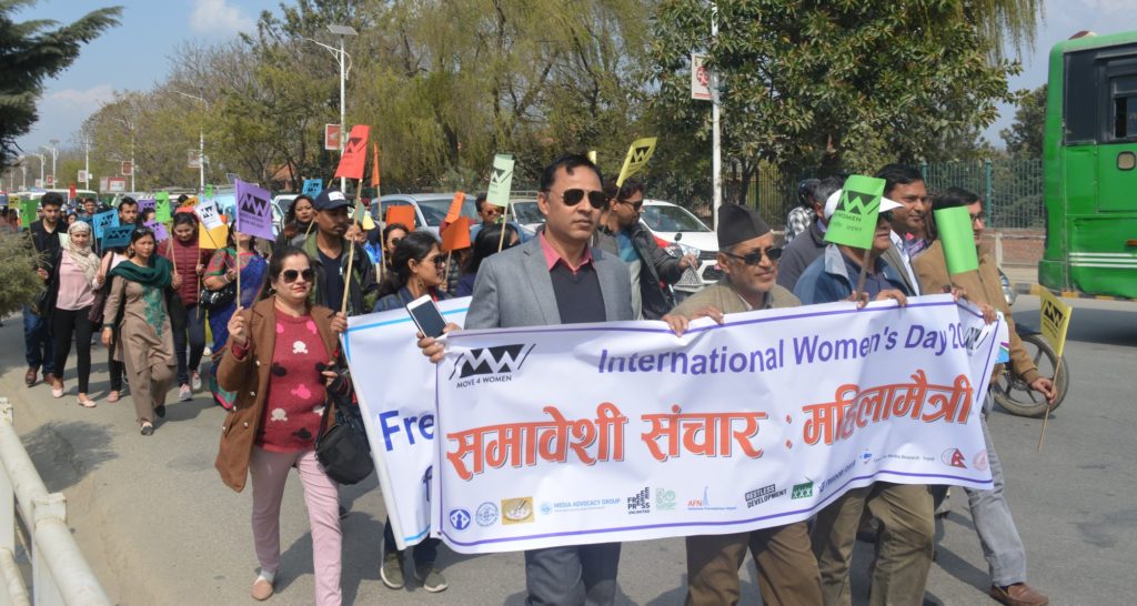 With the theme of gender equality in Nepal media, a rally was organized from a local Exhibition Road to the Kathmandu Durbar Square. In the rally named 'Move for Women', the participants carried placards, reading: Respect Women; Let's Think for Women's Rights; Protect Women's Right; More Female in Media, Inclusive Media etc. The march was for sensitization of women rights and advocacy of equal rights of women in media.