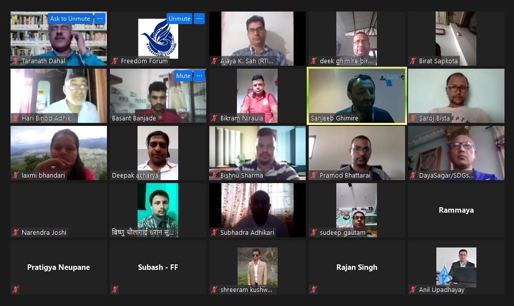 Similarly, Executive Chief at Freedom Forum Taranath Dahal believed that such togetherness of RTI campaigners to share experience would help expand RTI regime and build good governance. As the corruption cases were still rife, the RTI campaign needs to be continued. Collaborative efforts can help ensure safety to advocates of good governance- the RTI campaigners. The virtual programme was organized by Freedom Forum. The FF has been organizing such programs marking September as the RTI month. September 28 is marked as the International Day of the Universal Access to Information across the globe.