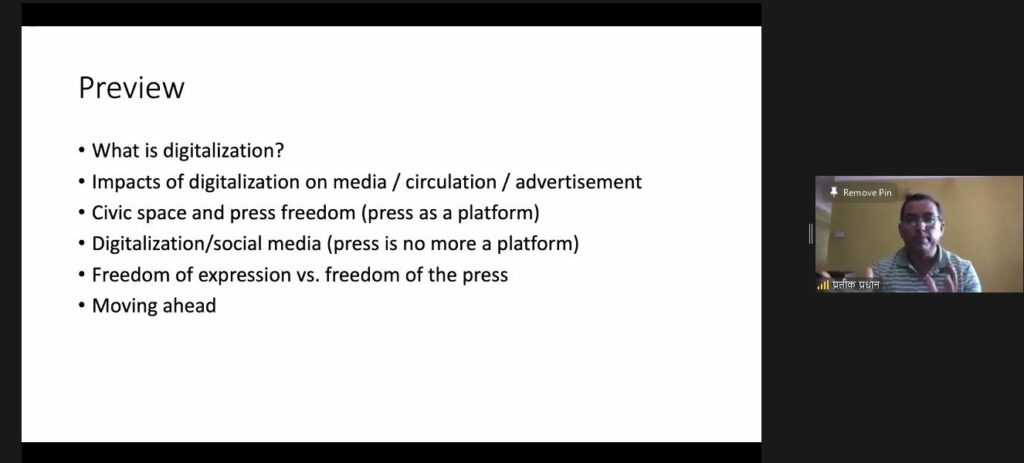 Former editor at Himalayan Television Binod Dhungel said that digitalization of media is the need of the time and Covid- 19 intensified it. Future of traditional media is in crisis because of rapid growth of internet based media, he said, adding that it is hard to distinguish mainstream and other media. Credibility of online media platform is in question.