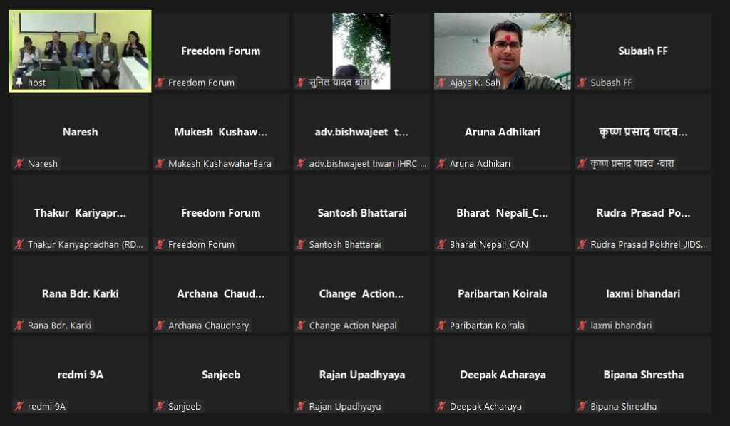 Total 44 participants including National Information Commissioner, representatives from nationwide networks of Right to Information, civil society, media and SDG network participated in the session and shared their views on current status of the implementation of RTI. FF's media monitoring coordinator Narayan Ghimire moderated the session.