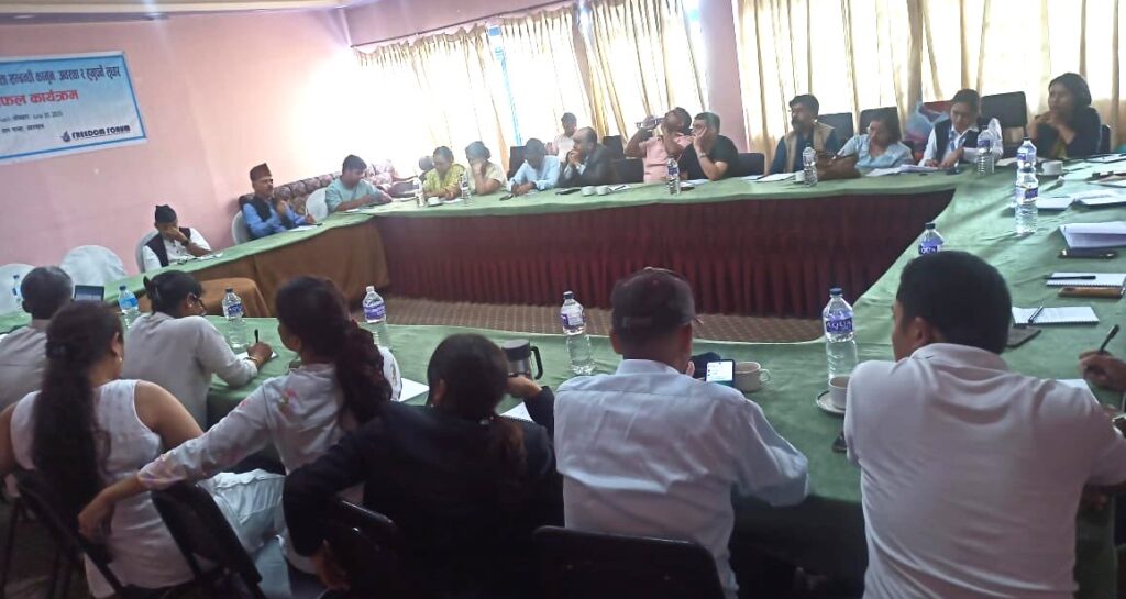 Freedom Forum's Executive Chief Taranath Dahal welcomed all the participants and shed light on the objective of the program. He said, "Periodic discussion on the rights provided by the constitution and existing national and international laws is necessary. Right to freedom of expression and freedom of opinion, the fundamental rights guaranteed by our constitution and international human rights instrument, needs respect and be enforced effectively." Major objective of the program was to analyse whether the laws and policies governing freedom of expression align with the constitution and Nepal's commitments in the international arena.